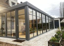 Création d'une véranda aluminium avec toiture plate conçue comme une vraie pièce à vivre ! les matériaux employés isolent du bruit de la route et de du froid.