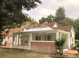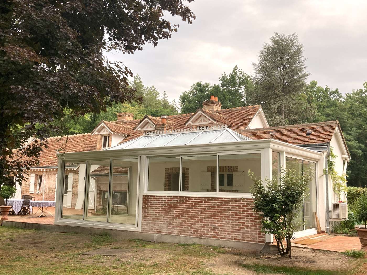 Pour cette véranda nichée au coeur de la Sologne, nous avons imaginé un ensemble qui s'intègre aux volumes existants, avec un muret en brique pour aménager ultérieurement une partie cuisine.