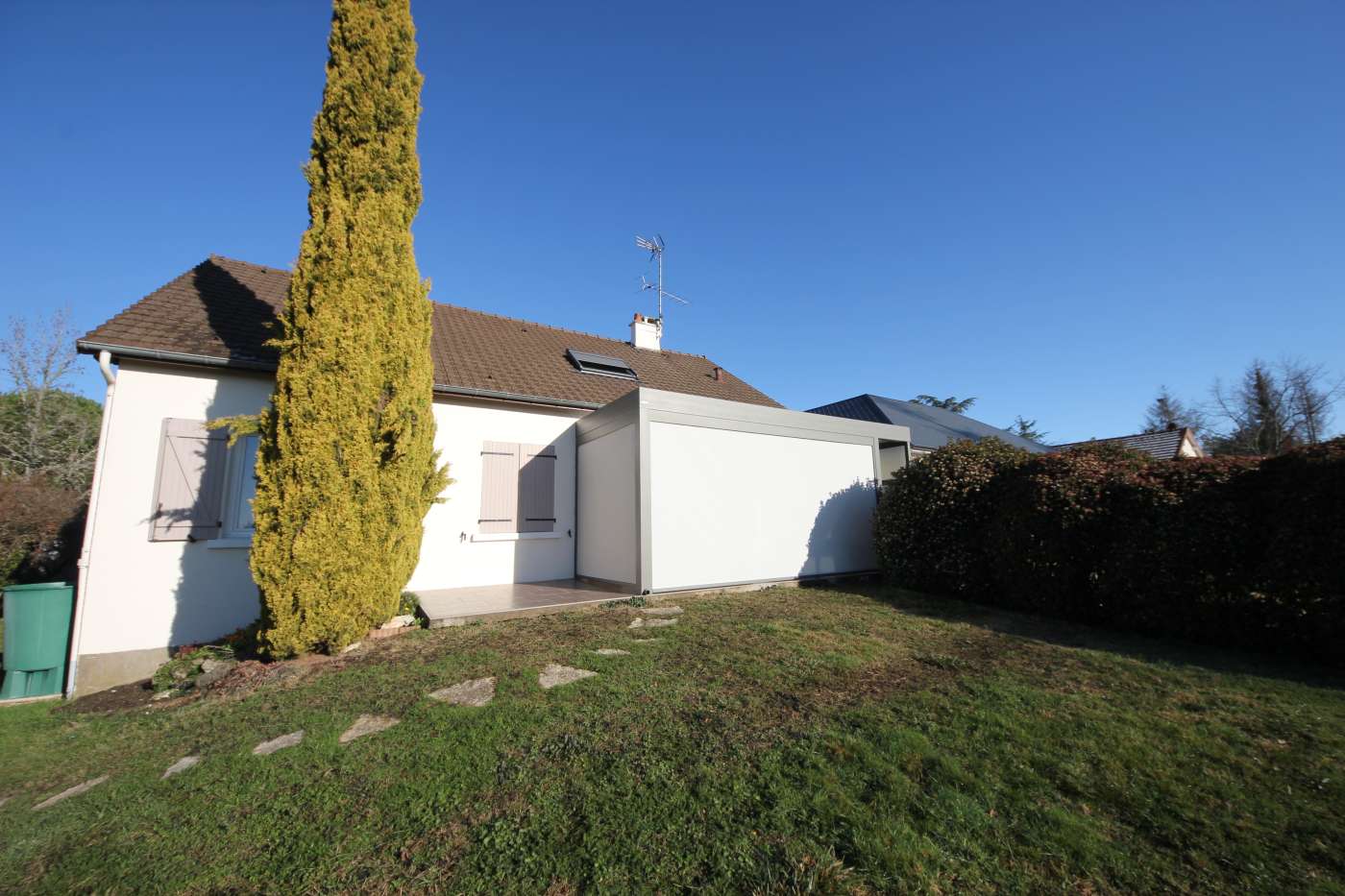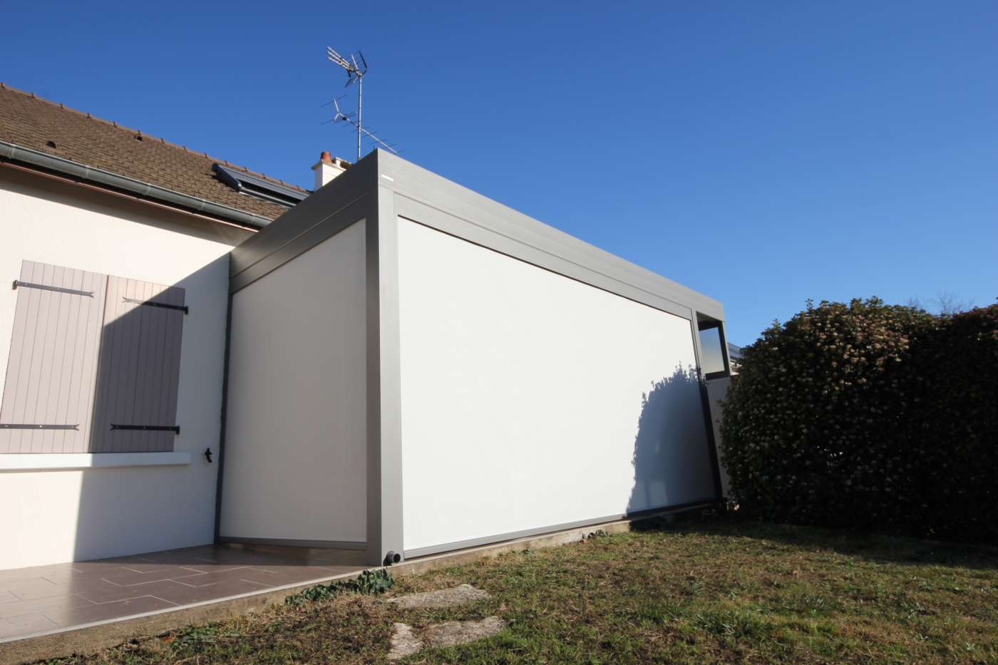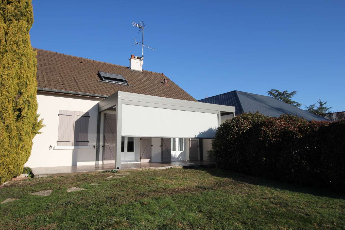 Pergola bioclimatique avec stores verticaux, posée en limite de propriété à Romorantin