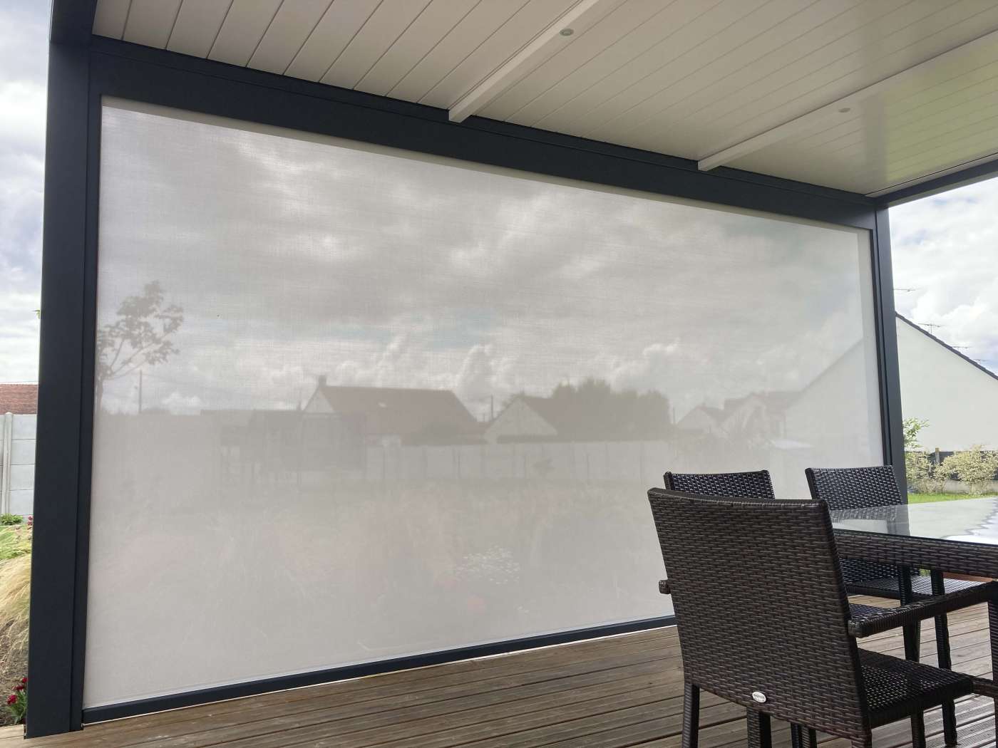 Le store en façade, toujours équipé d'une toile Sergé micro perforée est très résistante : zippée dans les coulisses latérales, elle est quasi indéchirable, résiste très bien au vents et aux aléas de la vie, et est très facile d'entretien.
