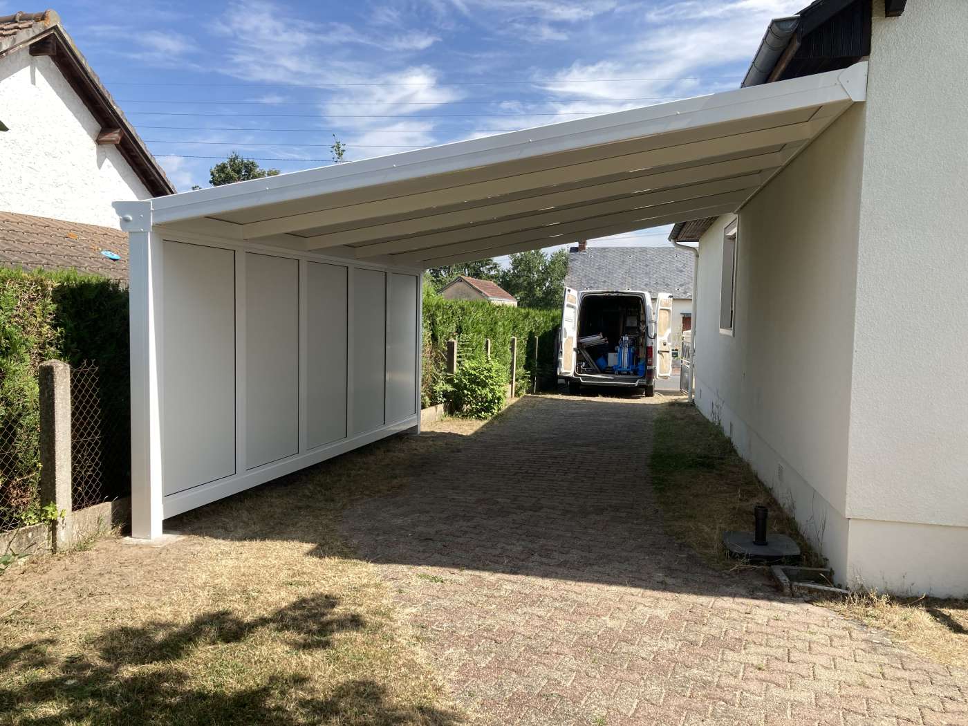 Carport aluminium avec fermeture d'un côté selon les exigeances du PLU, pose par nos soins à Romorantin
